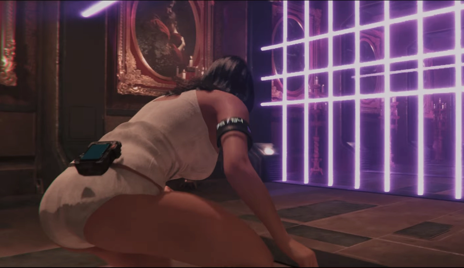 Après avoir trouvé un cameo près d’une statue, retourne dans Clone Monitoring. Lève les yeux et détruis la lampe bleue. Avance, franchis la porte, va au bout du couloir, puis tourne à gauche, puis encore à gauche. Continue tout droit pour entrer dans la zone bleue : tenue au fond.