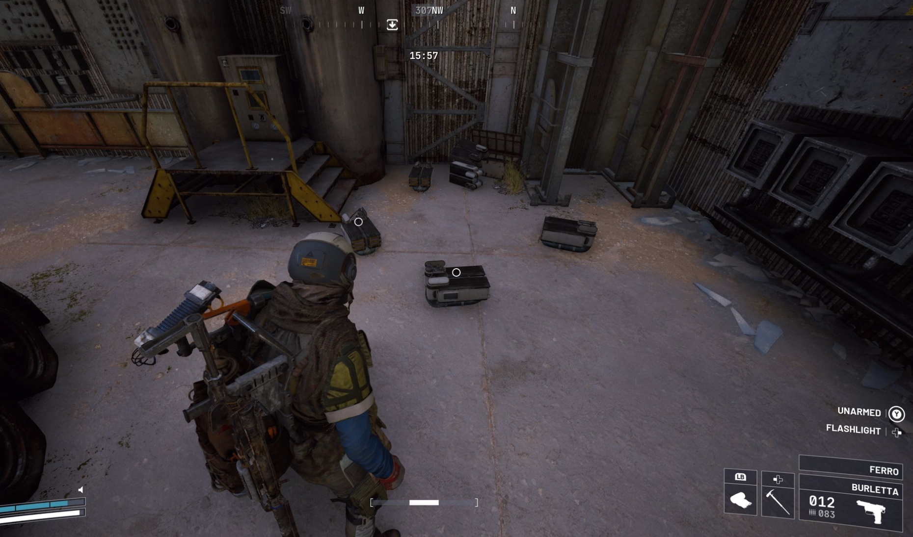 Une fois la batterie en main, direction le centre du hangar. L’Industrial Recharger se trouve au niveau inférieur, près d’une sortie du bâtiment, et il y a généralement deux machines côte à côte.